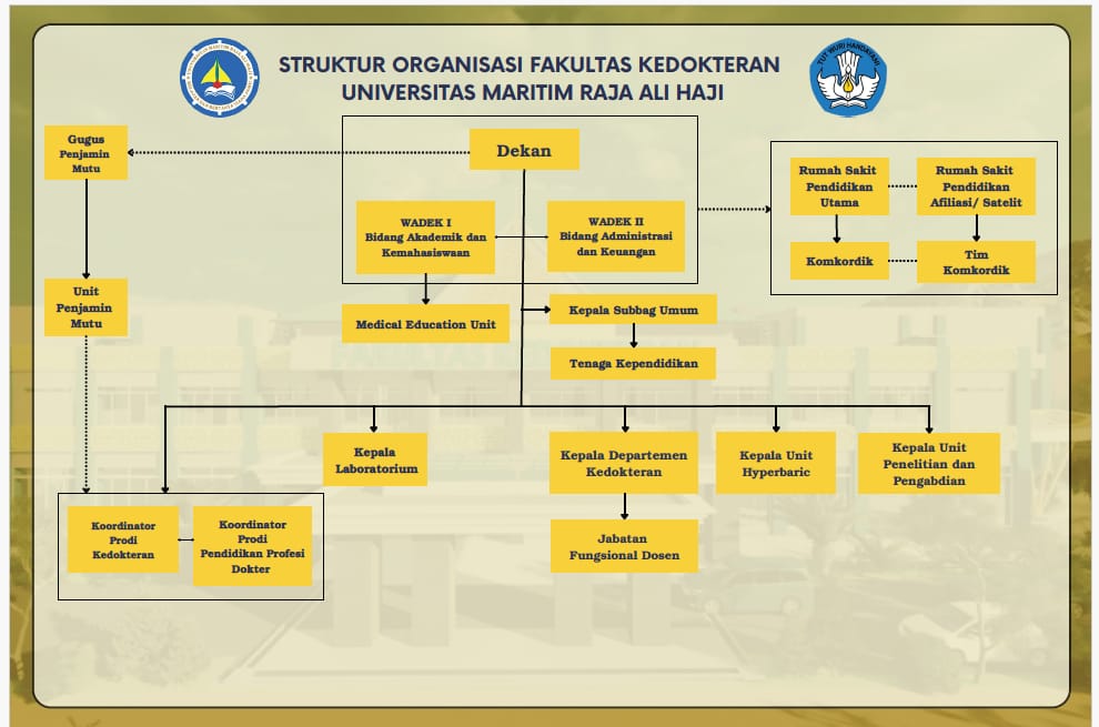 Fakultas Kedokteran Universitas Maritim Raja Ali Haji (UMRAH) memiliki struktur organisasi yang dirancang untuk mendukung pelaksanaan pendidikan kedokteran secara efektif, efisien, dan terintegrasi. Struktur ini mencakup unsur pimpinan fakultas seperti Dekan dan Wakil Dekan, serta unit-unit pendukung seperti Medical Education Unit (MEU), laboratorium, unit penelitian dan pengabdian, serta unit hyperbaric. Di samping itu, terdapat pula koordinasi lintas fungsi antara Koordinator Program Studi Kedokteran dan Koordinator Program Studi Profesi Dokter untuk menjamin kesinambungan pendidikan dari tahap akademik hingga tahap profesi.